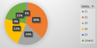 The most popular tabby was 22 (blotched tabby). 21% of all entries did not have any tabby markings.